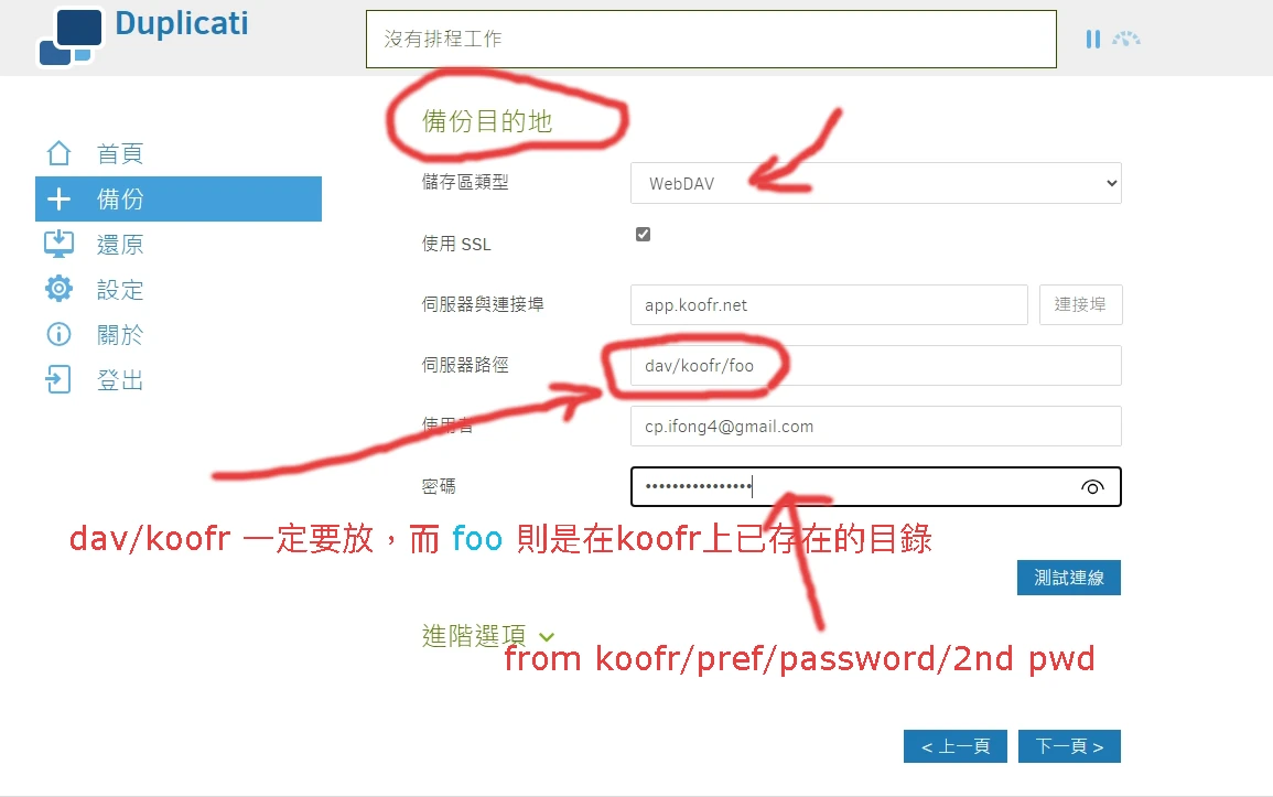 -- 避免重開機資料遺失 backup / adv koofr / @duplicati -- 為何用我? -- koofr 布落格上文章介紹如何備份 3 easy steps to backup -- 簡易說明上一個連結 -- duplicati launched -- dup dest as koofr -- link my computer to koofr